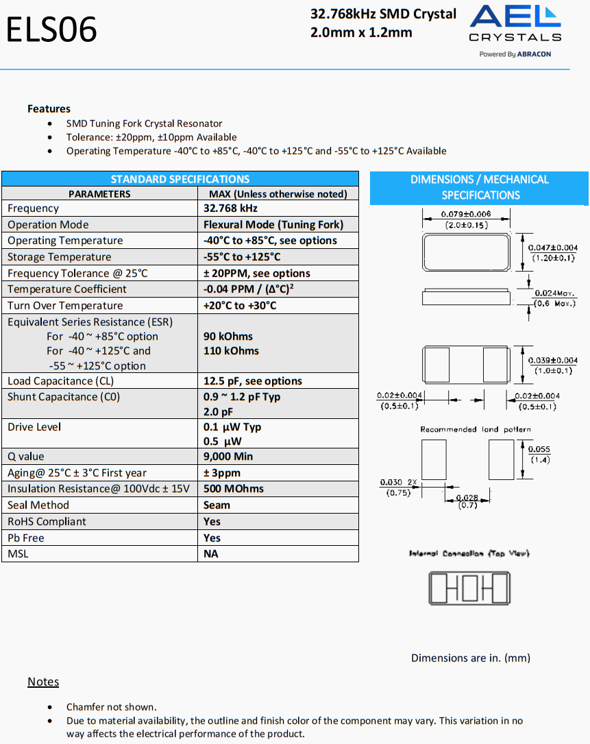 ELS06進口晶振,AEL低損耗晶體,ELS06-32.768kHz-9-T車載多媒體晶振,美國AEL晶振公司,ELS06晶振,ELS06-32.768kHz-9-T晶振,2012晶振,歐美晶振,二腳晶振,超小型晶振,AEL晶振,音叉晶振,環保無鉛晶振,高穩定性晶振,石英晶振,6G網絡終端晶振,無源晶振,低成本緊密頻率穩定晶體金屬封裝,特點:SMD音叉晶體諧振器,公差:±20ppm,±10ppm可用,工作溫度-40°C至+85°C, -40°C至+125°C和-55°C至+125°C可用,符合RoHS標準(無鉛),低外形通孔封裝,at切割晶體,優異的老化,非常緊密的溫度穩定性,行業標準引線間距。