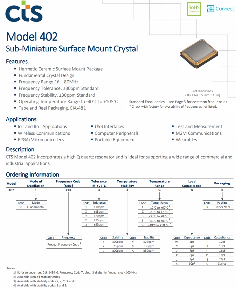 | 402F160XXCAR | CTS晶振 | 402 | MHz Crystal | 16MHz |