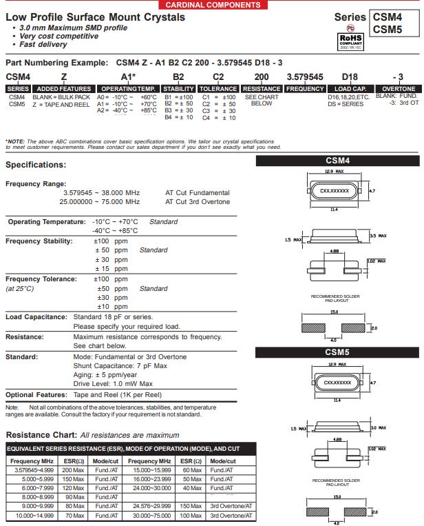 | CSM4Z-A2B3C3-40-14.7456D18 | Cardinal晶振 | CSM4 | 14.7456MHz | ±30ppm | 40 Ohm | -40°C ~ 85°C |