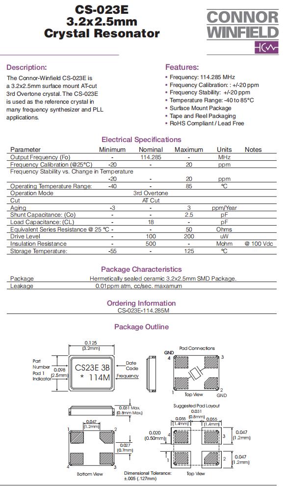 | CS-023-114.285M | Connor-Winfield | CS-023 | 114.285MHz | ±20ppm | ±20ppm | 18pF | 80 Ohm | -40°C ~ 85°C |