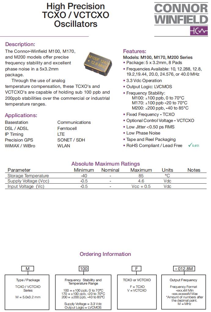 M170V-019.44M|進口壓控溫補晶振|6G無線通信晶振,ConnorWinfield晶振,M170有源晶振,M170V-019.44M晶振,進口壓控溫補晶振,5032mm晶振,頻率19.44MHz,電壓3.3V,工作溫度-20~70°C,頻率穩定性100ppb,低抖動晶振,低相噪晶振,6G無線通信晶振,精密GPS導航系統晶振,基站應用晶振,無線局域網晶振,Femtocell晶振.