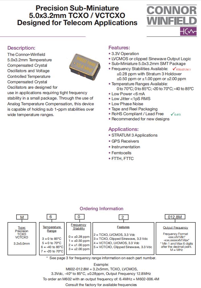 M602-012.8M,低相噪石英振蕩器,6G基站晶振,ConnorWinfield晶振,美國進口晶振,M60有源晶振,M602-012.8M晶振,5032mm晶振,低相噪晶振,石英晶體振蕩器,頻率12.8MHz,電壓3.3V,工作溫度-40~85°C,頻率穩定性0.28ppm,低抖動晶振,低功耗晶振,6G基站晶振,GPS接收器晶振,儀器儀表應用晶振,Femtocells晶振,FTTH晶振.
