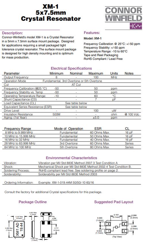 | XM-1-018.432M | Connor-Winfield | XM-1 | 18.432MHz | ±50ppm | ±50ppm | 16pF | 40 Ohm | -10°C ~ 60°C |