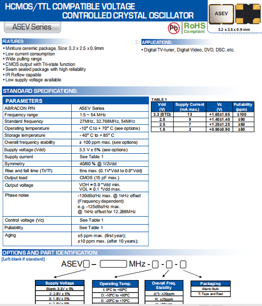 ABRACON晶振,ASEV晶振,壓控晶體振蕩器.高精度超小型的表面貼片型石英晶體振蕩器,最適用于移動(dòng)通信終端的基準(zhǔn)時(shí)鐘等移動(dòng)通信領(lǐng)域.比如智能手機(jī),無(wú)線通信,衛(wèi)星導(dǎo)航,平臺(tái)基站等較高端的數(shù)碼產(chǎn)品,晶振本身小型,薄型具備各類移動(dòng)通信的基準(zhǔn)時(shí)鐘源用頻率,貼片晶振具有優(yōu)良的電氣特性,耐環(huán)境性能適用于移動(dòng)通信領(lǐng)域,滿足無(wú)鉛焊接的高溫回流溫度曲線要求.