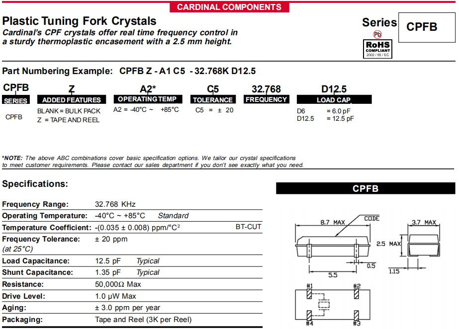 Cardinal晶振,CPFB晶振,石英晶體諧振器.32.768K系列具有超小型,薄型,質(zhì)地輕的表面貼片音叉型石英晶體諧振器,晶振產(chǎn)品本身具備優(yōu)良的耐熱性,耐環(huán)境特性,在辦公自動(dòng)化,家電領(lǐng)域,移動(dòng)通信領(lǐng)域可發(fā)揮優(yōu)良的電氣特性,符合無鉛標(biāo)準(zhǔn),滿足無鉛焊接的回流溫度曲線要求,金屬外殼的石英晶振使得產(chǎn)品在封裝時(shí)能發(fā)揮比陶瓷晶振外殼更好的耐沖擊性能.