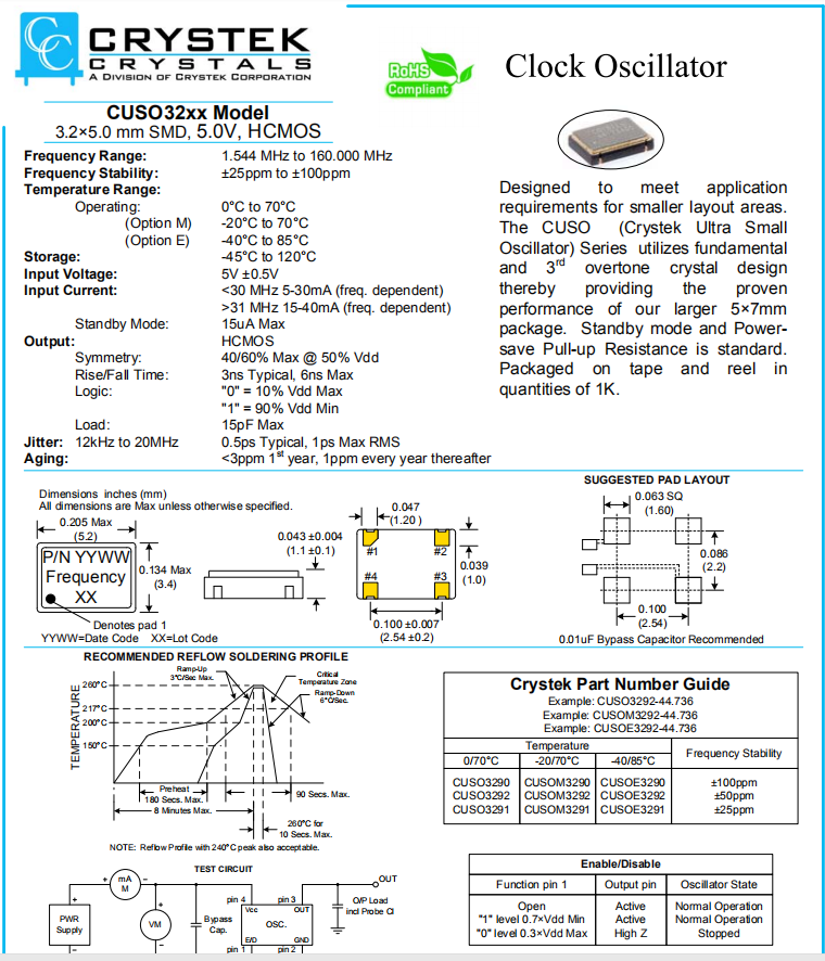 CRYSTEK晶振,CUSO32xx晶振,有源晶體振蕩器.有源晶振,是只晶體本身起振需要外部電壓供應(yīng),起振后可直接驅(qū)動(dòng)CMOS集成電路,產(chǎn)品本身已實(shí)現(xiàn)與薄型IC(TSSOP封裝,TVSOP封裝)同樣的1mm厚度,斷開(kāi)時(shí)的消費(fèi)電流是15µA以下,編帶包裝方式可對(duì)應(yīng)自動(dòng)搭載及IR回流焊接(無(wú)鉛對(duì)應(yīng))產(chǎn)品有幾種電壓供選1.8V,2.5V,3V3.3V,5V,以應(yīng)對(duì)不同IC產(chǎn)品需要.