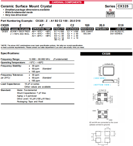 Cardinal晶振,CX325晶振,壓電石英晶體.小型貼片石英晶振,外觀尺寸具有薄型表面貼片型石英晶體諧振器,特別適用于有小型化要求的市場(chǎng)領(lǐng)域,比如智能手機(jī),無(wú)線藍(lán)牙,平板電腦等電子數(shù)碼產(chǎn)品.晶振本身超小型,薄型,重量輕,晶體具有優(yōu)良的耐環(huán)境特性,如耐熱性,耐沖擊性,在辦公自動(dòng)化,家電相關(guān)電器領(lǐng)域及Bluetooth,Wireless LAN等短距離無(wú)線通信領(lǐng)域可發(fā)揮優(yōu)良的電氣特性,滿足無(wú)鉛焊接的回流溫度曲線要求.