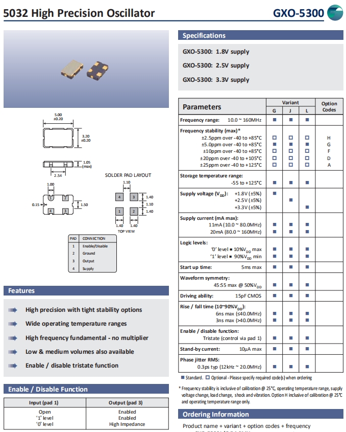 Golledge晶振,GXO-5300晶振,石英晶體振蕩子.5032mm體積的石英晶體振蕩器,有源晶振,該產品可驅動2.5V的溫補晶振,壓控晶振,VC-TCXO晶體振蕩器產品,電源電壓的低電耗型,編帶包裝方式,可對應自動高速貼片機自動焊盤,及IR回流焊盤(無鉛對應),為無鉛產品,小型,質地輕.產品被廣泛應用到集成電路,程控交換系統(tǒng),無線發(fā)射基站.