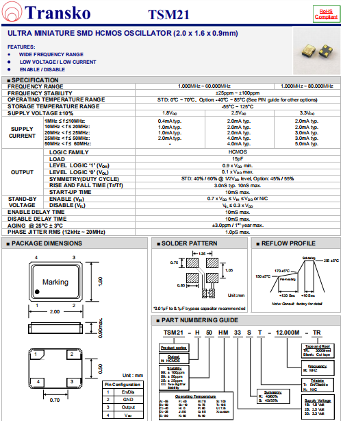 Transko晶振,TSM21晶振,低抖動石英振蕩器.智能手機晶振,產(chǎn)品具有高精度超小型的表面貼片型石英晶體振蕩器,最適用于移動通信終端的基準(zhǔn)時鐘等移動通信領(lǐng)域.比如智能手機,無線通信,衛(wèi)星導(dǎo)航,平臺基站等較高端的數(shù)碼產(chǎn)品,晶振本身小型,薄型具備各類移動通信的基準(zhǔn)時鐘源用頻率,貼片晶振具有優(yōu)良的電氣特性,耐環(huán)境性能適用于移動通信領(lǐng)域,滿足無鉛焊接的高溫回流溫度曲線要求.