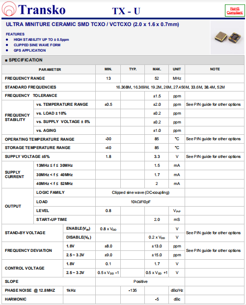 Transko晶振,TX-U晶振,溫度補償晶振.貼片晶振本身體積小,超薄型石英晶體振蕩器,特別適用于有目前高速發展的高端電子數碼產品,因為晶振本身小型化需求的市場領域,小型,薄型是對應陶瓷振蕩器(偏差大)和普通的石英晶體振蕩器(偏差小)的中間領域的一種性價比較出色的產品.產品廣泛用于筆記本電腦,無線電話,衛星導航HDD, SSD, USB, Blu-ray等用途,符合無鉛焊接的高溫回流焊曲線特性.
