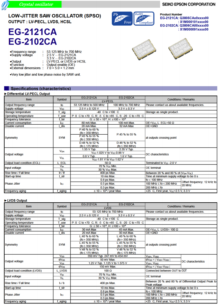 | X1M0002010010 | EG-2102CB | 106.250000 MHz | 5.00 x 3.20 x 1.40 mm | LV-PECL | 2.970 to 3.630 V |