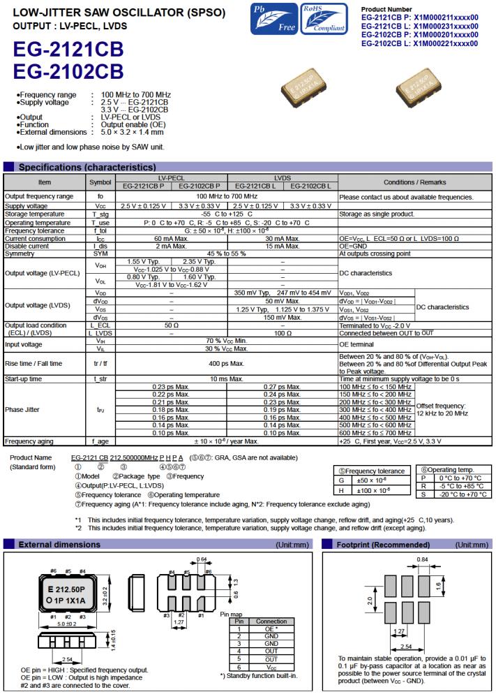 | X1M0002010004 | EG-2102CB | 156.250000 MHz | 5.00 x 3.20 x 1.40 mm | LV-PECL | 2.970 to 3.630 V |