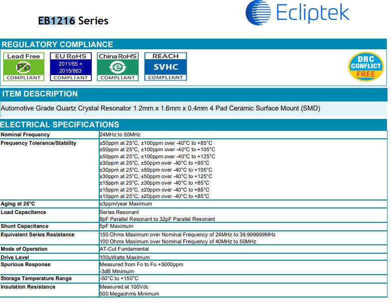 | EB1216YA10-24.000M TR | Ecliptek | EB1216 | MHz 晶體 | 24 MHz | ±50ppm | ±30ppm | 10pF |