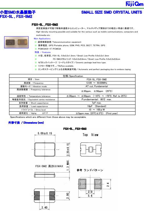 進口富士晶振,FSX-5L晶振,FSX-5M2石英晶振,GSM專用晶振,小型表面貼片晶振型,是標準的石英晶體振蕩器,適用于寬溫范圍的電子數碼產品,家電電器及MP3,MP4,播放器,單片機等領域.可對應8.000MHz以上的頻率,在電子數碼產品,以及家電相關電器領域里面發揮優良的電氣特性,滿足無鉛焊接的回流溫度曲線要求.