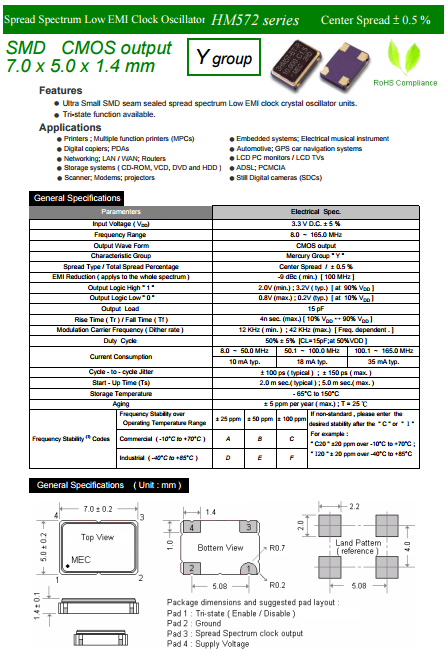MERCURY晶振,瑪居禮振蕩器,HM572Y石英振蕩子.小型SMD有源晶振,從最初超大體積到現(xiàn)在的7050mm,有著翻天覆地的改變,體積的變小也試產(chǎn)品帶來了更高的穩(wěn)定性能,接縫密封石英晶體振蕩器,精度高,覆蓋頻率范圍寬的特點,SMD高速自動安裝和高溫回流焊設(shè)計,Optionable待機輸出三態(tài)輸出功能,電源電壓范圍:1.8V?5 V,高穩(wěn)定性,低抖動,低功耗,主要應(yīng)用領(lǐng)域:無線通訊,高端智能手機,平板筆記本W(wǎng)LAN,藍牙,數(shù)碼相機,DSL和其他IT產(chǎn)品的晶振應(yīng)用,三態(tài)功能,PC和LCDM等高端數(shù)碼領(lǐng)域,符合RoHS/無鉛.