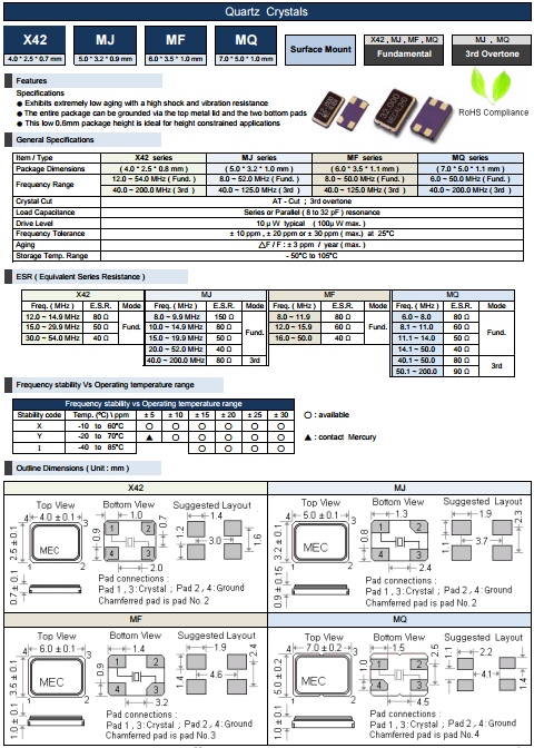 MERCURY晶振,石英晶體諧振器,MQ無源晶體.SMDcrystal器件,是民用小型無線數碼產品的最佳選擇,小體積的晶振被廣泛應用到,手機藍牙,GPS定位系統,無線通訊集,高精度和高頻率的穩定性能,非常好的減少電磁干擾的影響,是民用無線數碼產品最好的選擇,符合RoHS/無鉛.