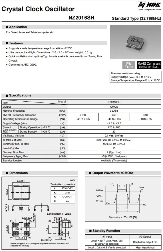 NZ2016SH-24.000MHZNSC5022C平板電腦晶振,NDK晶體振蕩器,日本NDK晶振,進口晶振,NZ2016SH型號是一款小體積晶振尺寸2.0x1.6x0.7mm四腳貼片晶振,32.768KHz晶振,石英晶體振蕩器,有源晶振,無鉛環保晶振,支持寬溫度范圍從-40°C到+125°C,超緊湊和輕,重量:0.01g,快速振蕩啟動時間(類型,1ms)是可用的相比,符合AEC-Q200,電源電壓(VCC)-0.3至+7.0 V,石英晶體振蕩器具有超小型,輕薄型,耐熱及耐環境特點,適用于智能手機,平板電腦,鐘表電子,無線網絡,藍牙模塊,可穿戴設備,汽車電子,醫療設備,物聯網應用等