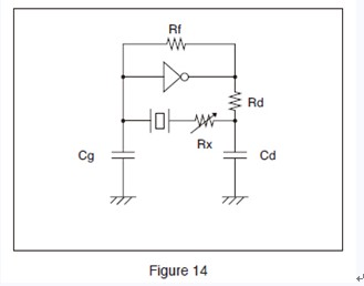 Add resistor "Rx" to the crystal unit in series and ensure that the oscillation starts or stops. The approximate negative resistance of the circuit is the value obtained by adding the effective resistance "Re" to the maximum resistance "Rx" when the oscillation starts or stops after gradually making Rx value larger.