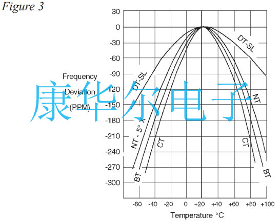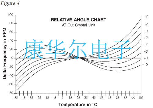 在各種元素中,貼片石英晶振的“AT”切割成了最受歡迎的,因?yàn)樗窍鄬^高的頻率,表現(xiàn)出優(yōu)異的頻率與溫度穩(wěn)定性并且以合理的成本廣泛獲得.該“AT”切割的頻率與溫度能力晶體單元如圖4所示.