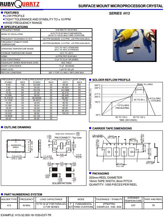 Rubyquartz晶體,H13無源諧振器,H13-12.000-18-1030-EXT-TR貼片晶振,貼片晶振本身體積小,超薄型石英晶體振蕩器,特別適用于有目前高速發(fā)展的高端電子數(shù)碼產(chǎn)品,因為晶振本身小型化需求的市場領(lǐng)域,小型,薄型是對應(yīng)陶瓷振蕩器(偏差大)和普通的石英晶體振蕩器(偏差小)的中間領(lǐng)域的一種性價比較出色的產(chǎn)品.產(chǎn)品廣泛用于筆記本電腦,無線電話,衛(wèi)星導(dǎo)航SSD,USB,Blu-ray等用途,符合無鉛焊接的高溫回流焊曲線特性.