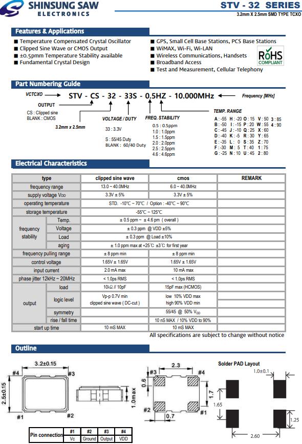 韓國(guó)新松晶振,STV-32貼片溫補(bǔ)晶振,STV-CS-32-33S-0.5HZ-10.000MHz有源振蕩子,小型SMD有源晶振,從最初超大體積到現(xiàn)在的7050mm,6035mm,5032mm,3225mm,2520mm體積,有著翻天覆地的改變,體積的變小也使產(chǎn)品帶來了更高的穩(wěn)定性能,接縫密封石英晶體振蕩器,精度高,覆蓋頻率范圍寬的特點(diǎn),SMD高速自動(dòng)安裝和高溫回流焊設(shè)計(jì),Optionable待機(jī)輸出三態(tài)輸出功能,電源電壓范圍:1.8V~5V,高穩(wěn)定性,低抖動(dòng),低功耗,主要應(yīng)用領(lǐng)域:無線通訊,高端智能手機(jī),平板筆記本W(wǎng)LAN,藍(lán)牙,數(shù)碼相機(jī),DSL和其他IT產(chǎn)品的晶振應(yīng)用,三態(tài)功能,PC和LCDM等高端數(shù)碼領(lǐng)域,符合RoHS/無鉛.