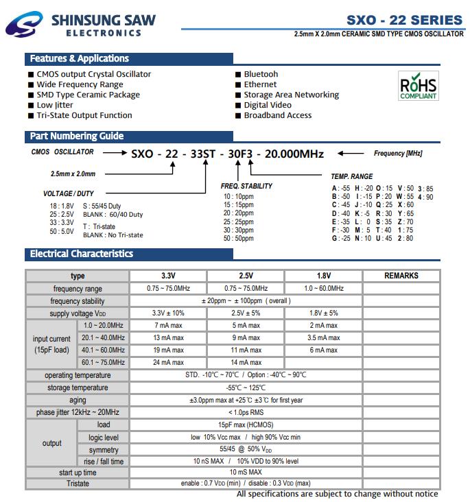 韓國(guó)新松晶振,SXO-22晶體振蕩器,SXO-22-15ST-30F3-20.000MHz晶振,有源晶振,是指晶體本身起振需要外部電壓供應(yīng),起振后可直接驅(qū)動(dòng)CMOS集成電路,產(chǎn)品本身已實(shí)現(xiàn)與薄型IC(TSSOP封裝,TVSOP封裝)同樣的1mm厚度,斷開時(shí)的消費(fèi)電流是15µA以下,編帶包裝方式可對(duì)應(yīng)自動(dòng)搭載及IR回流焊接(無鉛對(duì)應(yīng))產(chǎn)品有幾種電壓供選1.8V,2.5V,3V3.3V,5V,以應(yīng)對(duì)不同IC產(chǎn)品需要.
