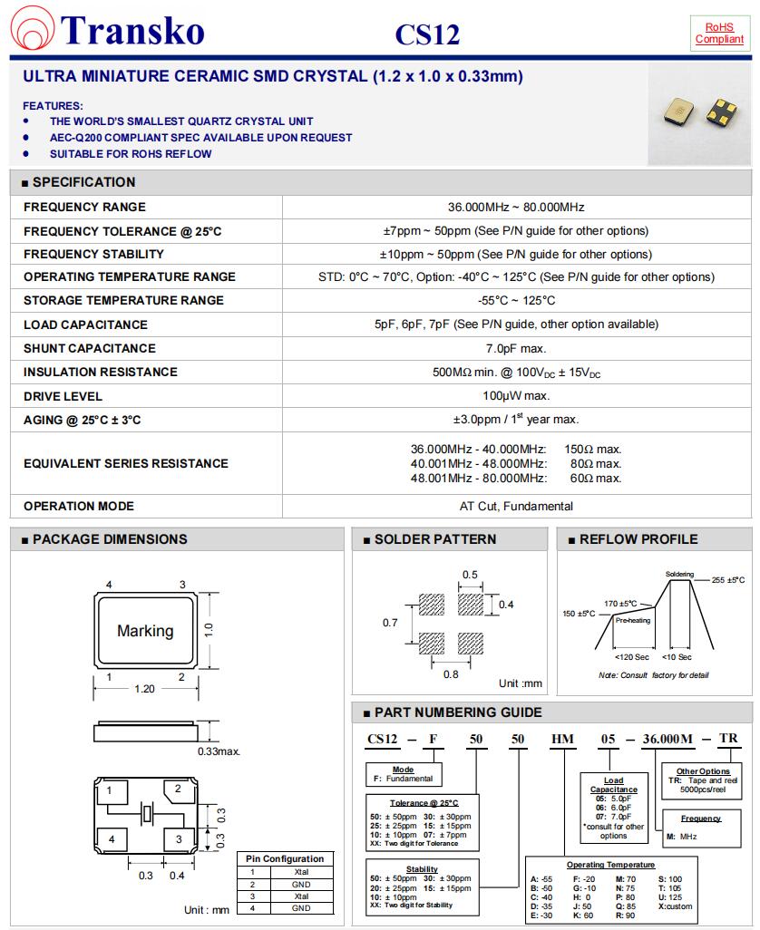 Transko晶振,CS12-F1020CQ06-20.000M-TR,6G無(wú)線應(yīng)用晶振參數(shù)表