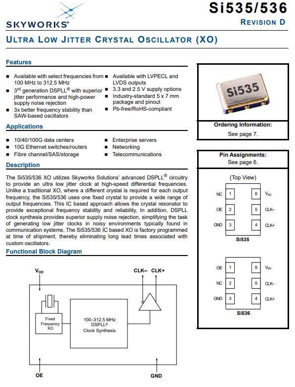 編碼501AAA27M0000CAF,Si535/536 XO時鐘晶體振蕩器,采用了Skyworks Solutions先進的DSPLL電路以在高速差分頻率下提供超低抖動時鐘。不像傳統(tǒng)的XO,每個輸出需要不同的晶體頻率,Si535/536使用一個固定晶體來提供寬范圍的輸出頻率。這種基于IC的方法允許晶體諧振器提供卓越的頻率穩(wěn)定性和可靠性。此外,DSPLL時鐘合成提供出色的電源噪聲抑制,簡化了任務在高噪聲環(huán)境中產(chǎn)生低抖動時鐘,通常出現(xiàn)在通信系統(tǒng)。