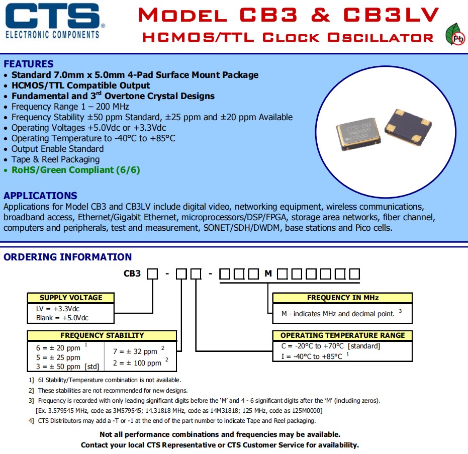 CTS晶振CB3LV型號,是一款小體積晶振尺寸7.0x5.0mm陶瓷封裝時鐘振蕩器,四腳貼片晶振,有源晶振,石英晶體振蕩器,HCMOS/TTL時鐘振蕩器,提供更小尺寸和增強的穩定性。較小的尺寸意味著它非常適合任何應用程序。增強的穩定性意味著它是當今需要嚴格的頻率控制的通信應用程序的完美選擇。有源晶振,應用包括數字視頻、網絡設備、無線通信、 寬帶接入、以太網/千兆以太網、微處理器/DSP/FPGA、存儲區域網絡、光纖通道, 計算機和外設、測試和測量、SONET/SDH/DWDM、基站和微微蜂窩。HCMOS/TTL時鐘振蕩器CB3LV-3I-66M0000非常適合任何應用程序