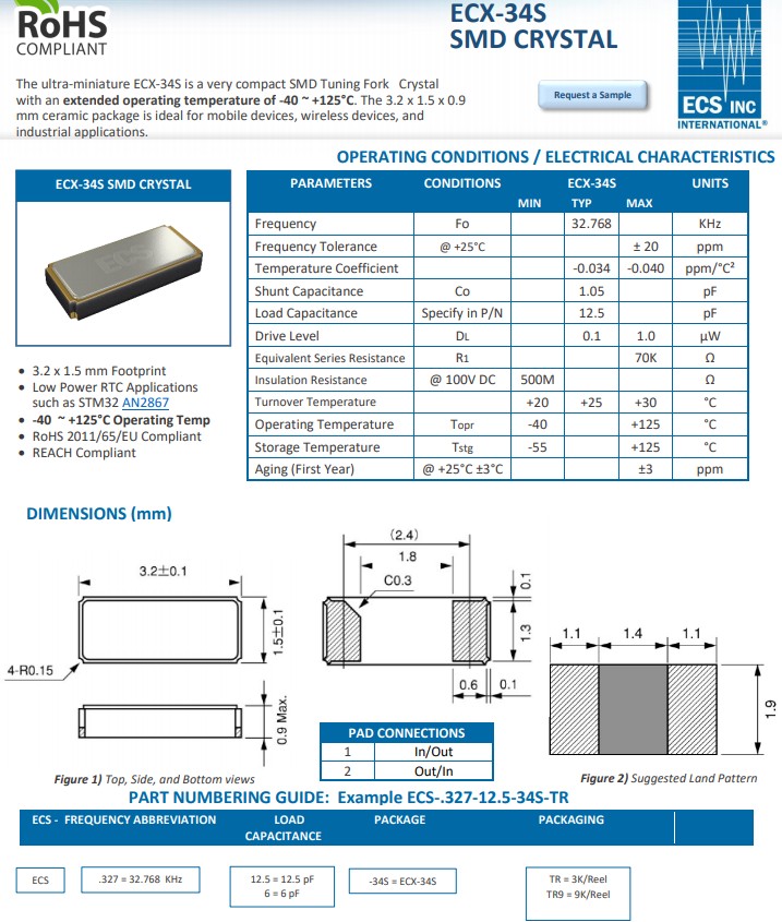 | ECS-.327-12.5-34RR-TR | ECScrystal | ECX-34RR | 32.768kHz | -40°C ~ 85°C | 2-SMD, No Lead |