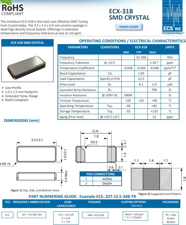 | ECS-.327-12.5-34B-TR | ECS晶振 | ECX-31B | kHz Crystal (Tuning Fork) | 32.768kHz | -40°C ~ 85°C |