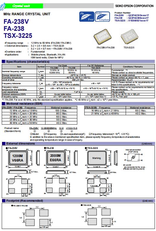 | Q22FA2380179416 | 3.2 x 2.5 x 0.7mm | FA-238 | 24.000000 MHz | 10 pF | +/-50 ppm | +/-50 ppm | -40 to +85 °C | ≤ 60 Ω |