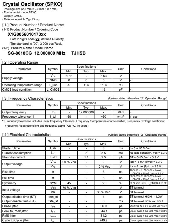 | X1G005601017300 | SG-8018CG | 12.000000 MHz | 2.50 x 2.00 x 0.80 mm | CMOS | 1.620 to 3.630 V | -40 to 105 °C | +/-50 ppm |