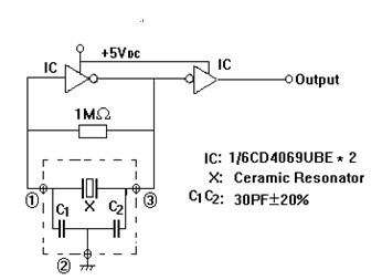 根據引出腳方式可分為SMD諧振器與直DIP諧振器,應用頻率可以分為低頻千赫系列,中頻和高頻諧振器兆赫系列。陶瓷諧振器需要與各種IC相配應用,常用IC有:4069UBE,TC74HCUO4P