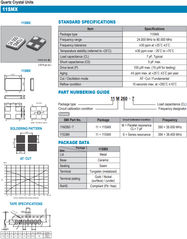 SMI晶振,貼片晶振,11SMX無源晶振.貼片石英晶體,體積小,焊接可采用自動貼片系統(tǒng),產(chǎn)品本身小型,表面貼片晶振,特別適用于有小型化要求的電子數(shù)碼產(chǎn)品市場領(lǐng)域,因產(chǎn)品小型,薄型優(yōu)勢,耐環(huán)境特性,包括耐高溫,耐沖擊性等,在移動通信領(lǐng)域得到了廣泛的應(yīng)用,晶振產(chǎn)品本身可發(fā)揮優(yōu)良的電氣特性,滿足無鉛焊接的高溫回流溫度曲線要求.