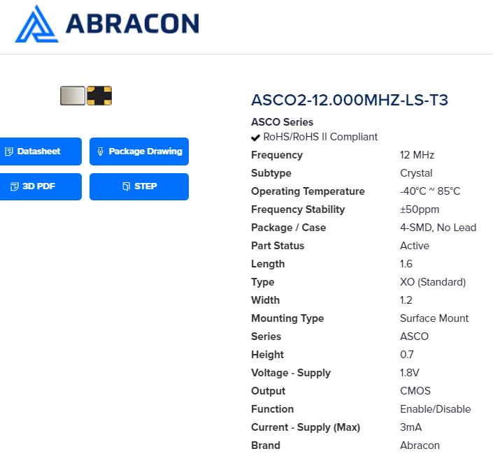 | ASFLMPC-12.000MHZ-T3 | Abracon晶振 | Pure Silicon™ ASFLMP | MEMS (Silicon) | 12MHz | 2.25 V ~ 3.6 V | -20°C ~ 70°C |