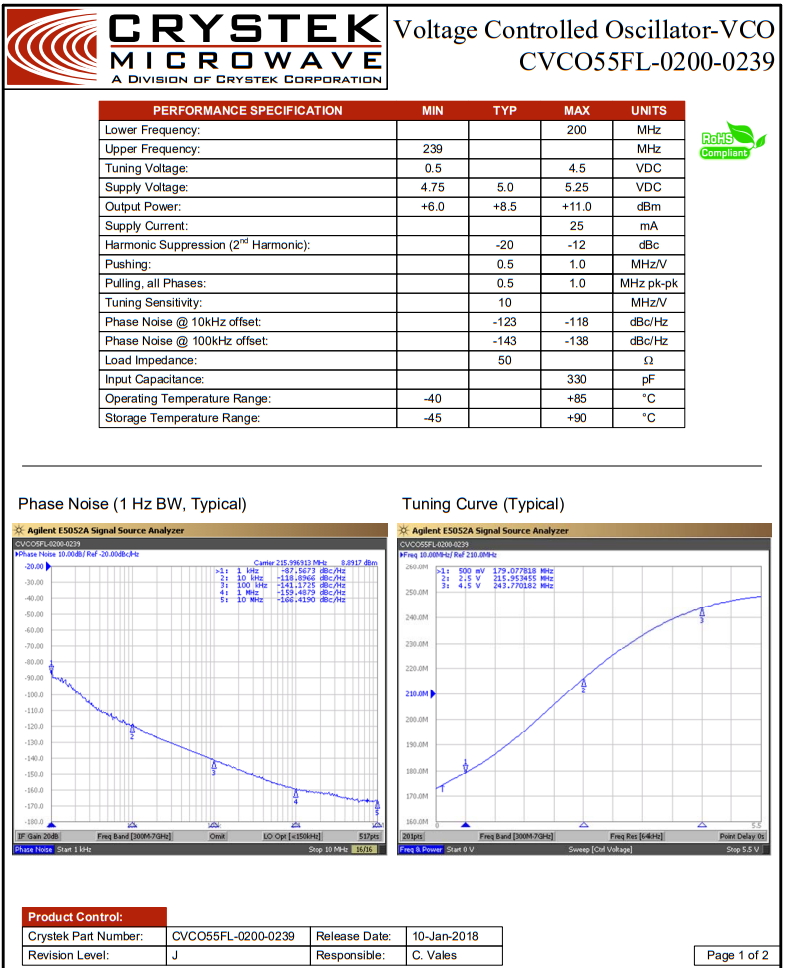 CVCO55FL-0200-0239在美國(guó)設(shè)計(jì)和制造,采用行業(yè)標(biāo)準(zhǔn)的0.5 x 0.5英寸SMD封裝。輸入電壓為5v,最大電流消耗為25ma。拉力和推力分別最小化到1.0 MHz pk-pk和1.0 MHz/V。二次諧波抑制典型值為-20 dBc。